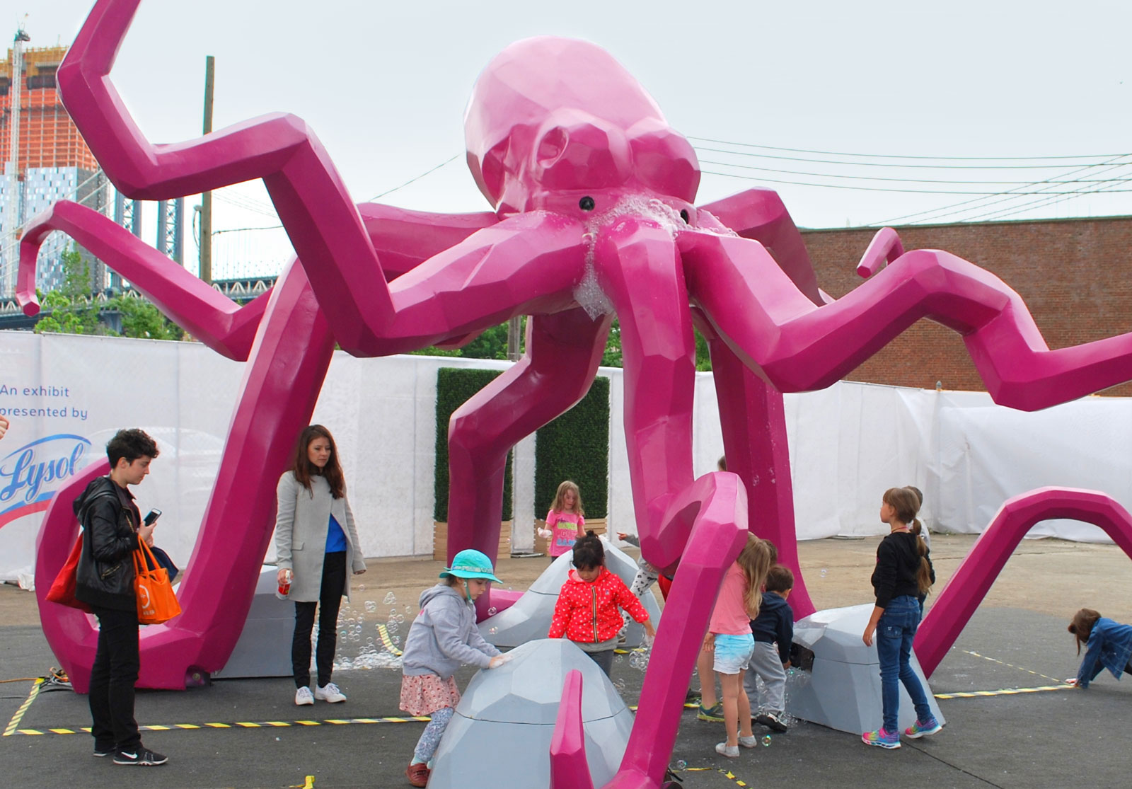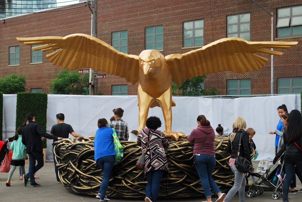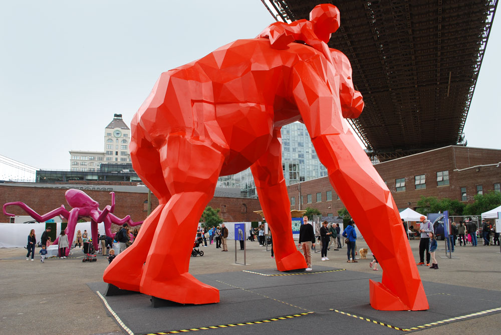 A large purple octopus sloshed above the crowd, tentacles outstretched, bubbles spewing forth from beneath its eyes. When framed against the sky at the right angle, it looked like it could wrap itself around a skyscraper in the distance. In another corner of the lot, perched over a golden nest with its wings spread wide, a fierce-looking golden eagle watched over its young that were ready to hatch. And towering above everyone and everything, a giant, orange orangutan mother loomed over the crowd with her child clinging to her back. Being framed beneath the Brooklyn Bridge and against the Manhattan skyline imbued their appearance with a King Kong quality.