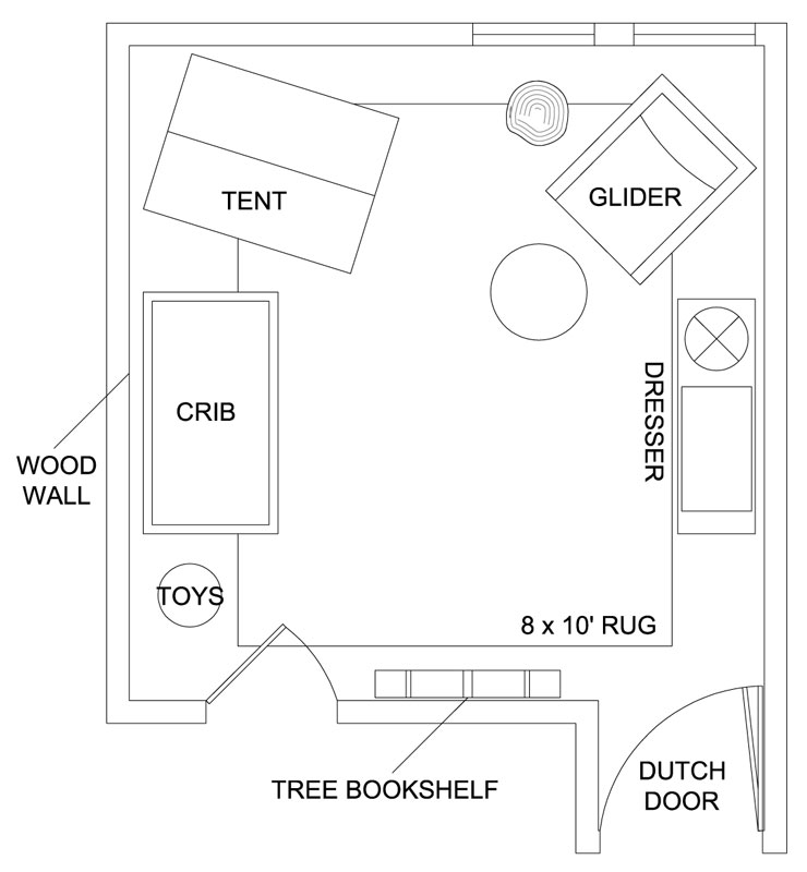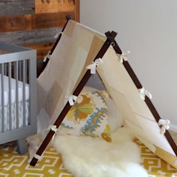 Camping comes inside when we add a play tent in the nursery for baby. With our specially milled lumber, we help our parents lay out a pattern for the accent wall. We open the room up for access with a Dutch door, then show parents how to anchor furniture to the wall for child safety.